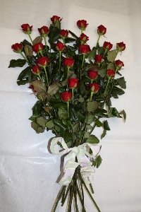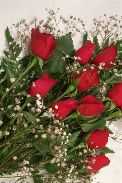 Bouquet de roses rougesaccompagnées de gypsophile