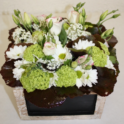 Joli montage fleurs coupées dans contenant bois 25 € |